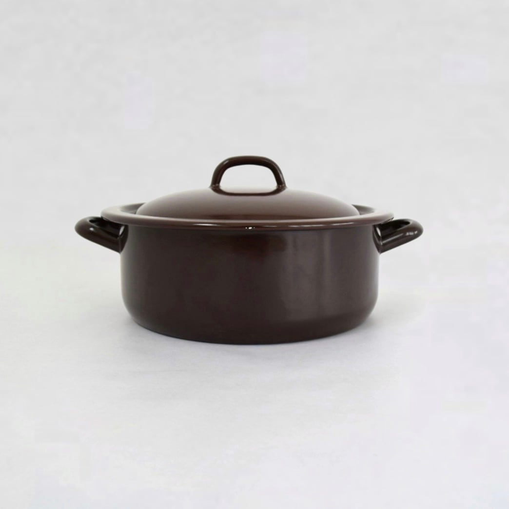 ガラスコーティングの表面が美しいシンプルなデザインのホーロー鍋です。