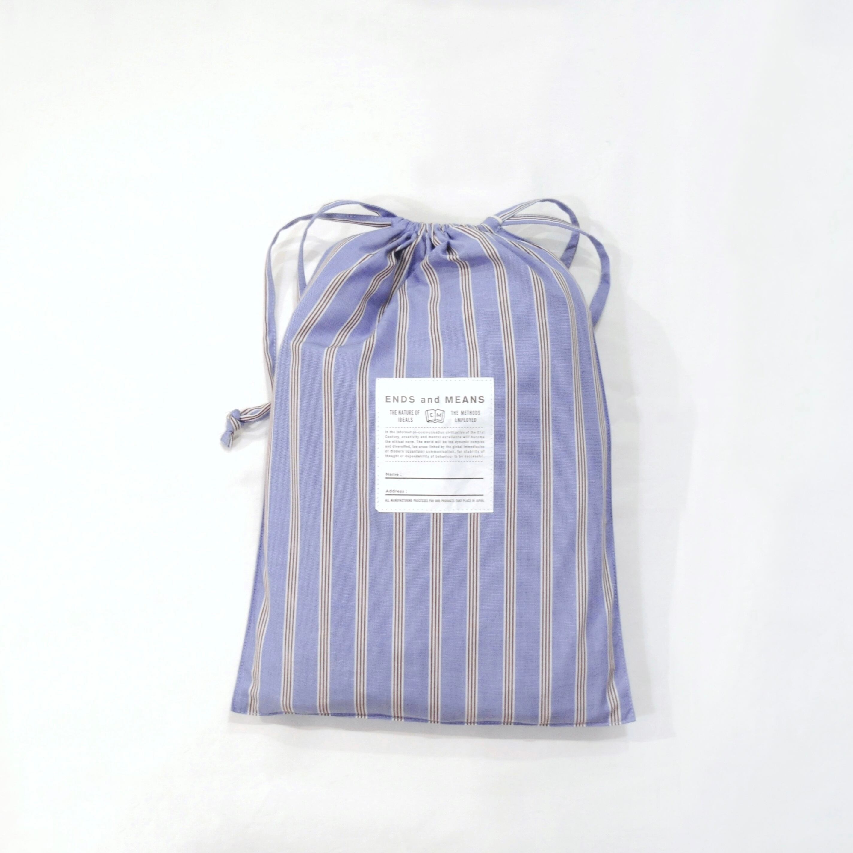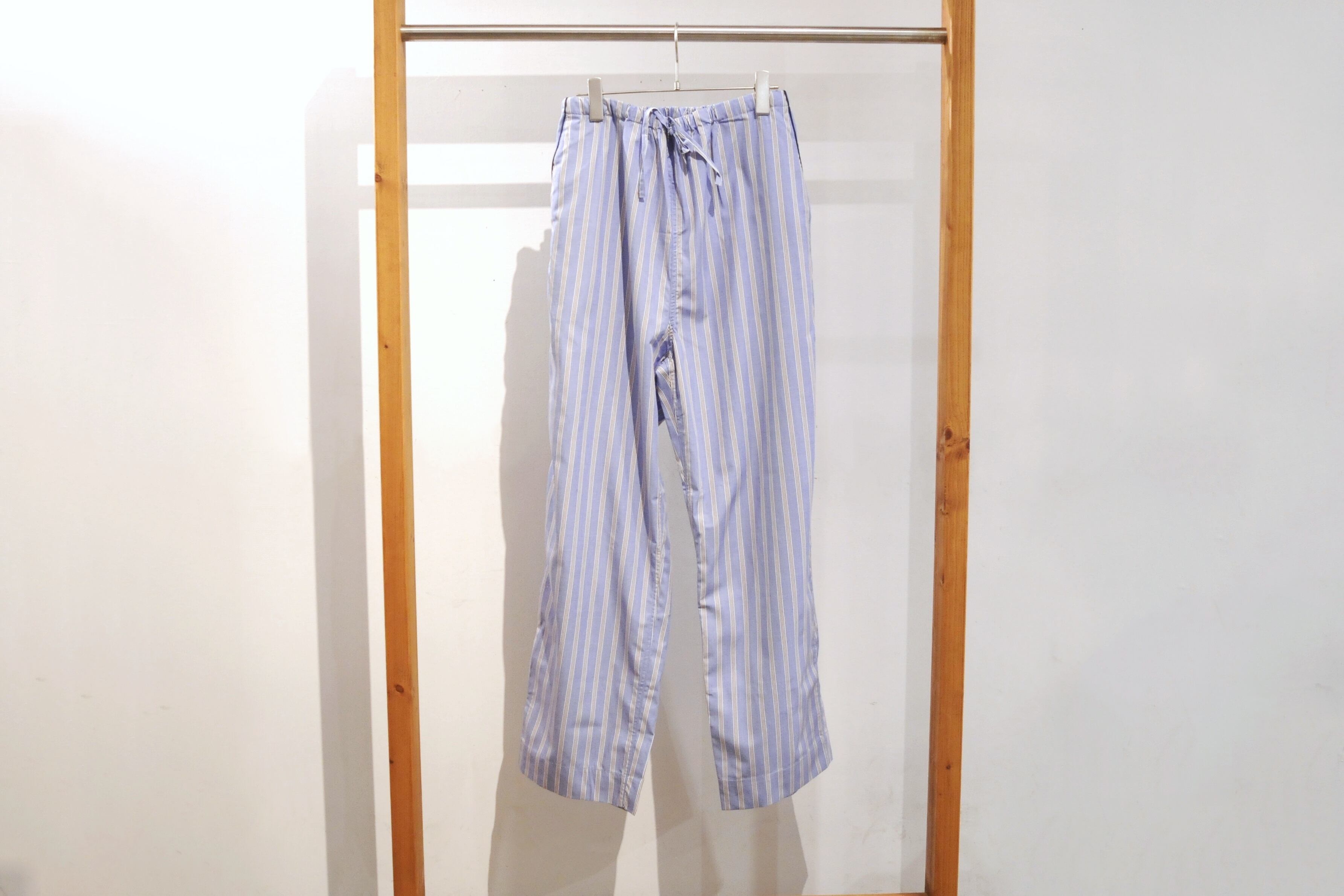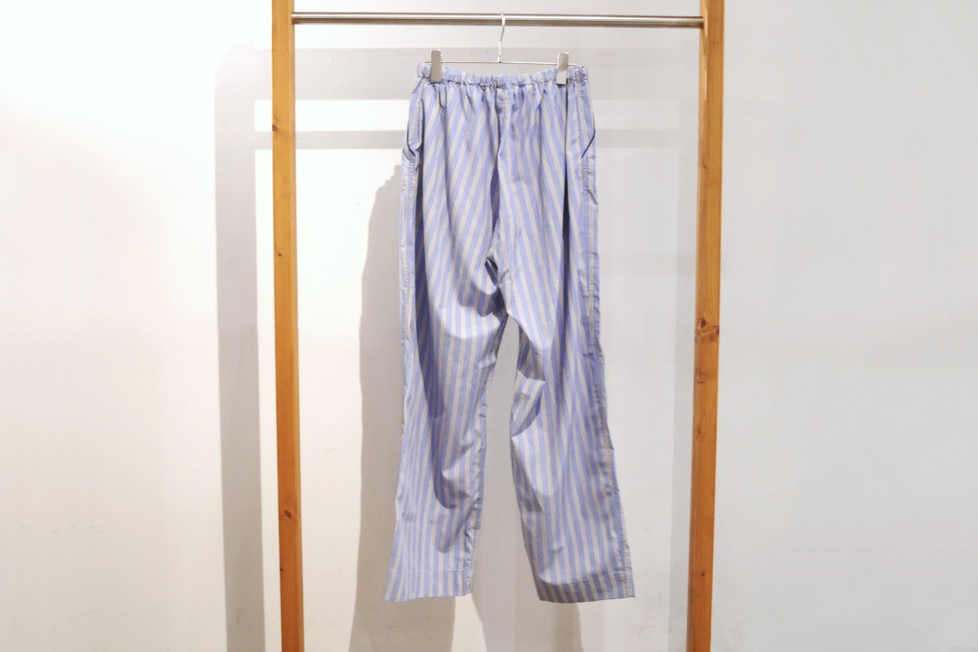 サックスにブラウンのストライプが優しい印象なリラックスセットアップです。